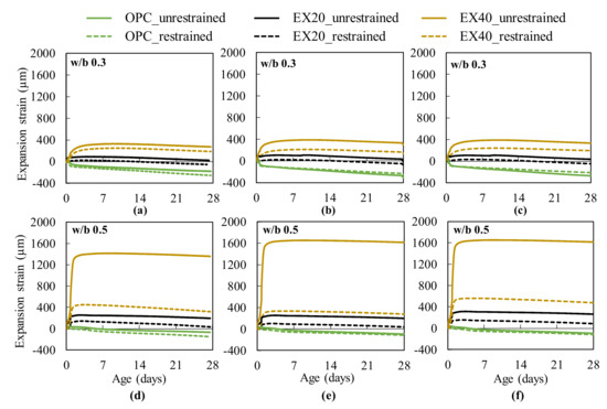 Figure 6 shows the expansion strain of the non-expansive and expansive concrete with different w/b ratios and types of restrained conditions. The expansion strain tendency was similar to the length change ratio of concrete (Figure 5). However, unlike in the test results of the length change ratio of concrete with w/b 0.3, the effect of the restrained condition on the expansion strain of the expansive concrete was observed, which may be attributed to the different testing positions. Meanwhile, the length change of the sample was determined by measuring the change of the whole sample. The expansion strain test was performed on the inside of a sample. Relevant to the expansion strain of EX40 with different types of restrained conditions (Figure 6e,f), the expansion strain of concrete restrained by the JIS A 6202 was higher than that restrained by the free standard. The higher expansion strain of EX40 by the JIS method can be explained as follows: the expansion strain of concrete was determined by the strain gauge attached to the steel bar surface at the center of the specimen to measure the steel bar strain. In other words, the steel bar expanded (shrunk) with the expansion (or shrinking) of concrete. Therefore, when the expansive concrete was restrained by the JIS method, the effect of the expansion force on the steel bar was higher than that on the steel bar of free standard.