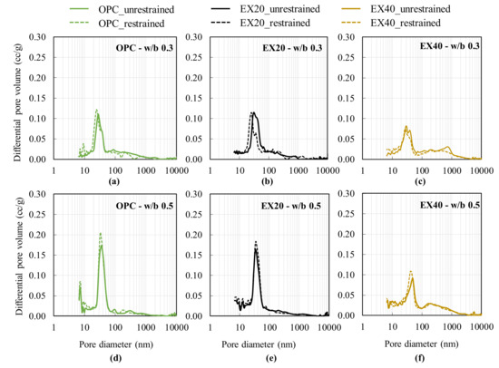 Effect of the triaxial restrained condition on the pore size distribution of the cement and expansive mortar under the restrained and unrestrained conditions with different w/b ratios: (a–c) test results of OPC, EX20, and EX40 with w/b 0.3, respectively; and (d–f) test results of OPC, EX20, and EX40 with w/b 0.5, respectively.
