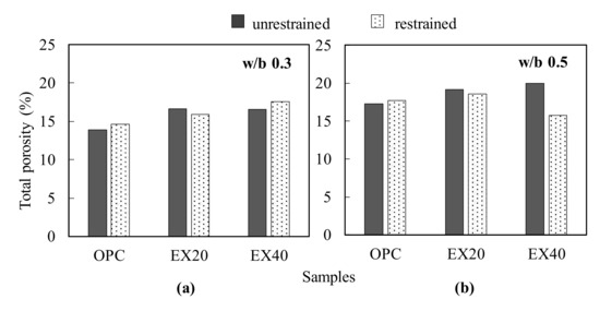 Relationship between the total porosity and EX contents under the unrestrained and triaxial restrained conditions: (a) w/b ratio of 0.3 and (b) w/b ratio of 0.5.