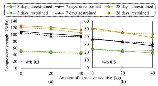 Relationship between the EX content and compressive strength of concrete under the unrestrained and restrained conditions: (a) w/b ratio of 0.3 and (b) w/b ratio of 0.5.