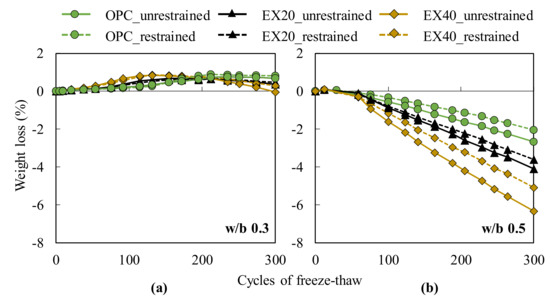 Figure 12 plots the mass change of all concrete mixtures under the restrained and unrestrained conditions following the test cycle. Similar to the relative dynamic modulus of elasticity, the weight of the specimens at the w/b ratio of 0.5 decreased with the increasing EX dosage at 300 cycles. The effect of the confinement was only observed for EX40 as the weight loss of the unrestrained concrete became slightly larger than that of the restrained concrete. The weight loss percentage was not observed for all the samples at the w/b ratio of 0.3, which may be explained by the dense structure of the concrete at the lower w/b ratio. However, the mass change was observed. Figure 12a shows that from 0 to 200 cycles, the mass change of the samples increased when the EX replacement weight was increased because the capillary pore volume in the expansive concrete was larger than that of the cement concrete [23], thereby leading to the expansive concrete easily absorbing water. However, from 200 to 300 cycles, the results showed an opposite trend as the mass change decreased when the EX amount was increased. This finding can be attributed to the increase in the scaling on the sample surface. The results also showed that the effect of the restrained condition on the weight loss percentage of all samples was hardly observed.