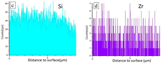 Surface and cross-section morphologies of the EB-cured PZCS fiber are shown in Figure 1a,b, which shows a smooth surface and very dense cross-section fracture morphology of the green fiber after EB-curing in argon. The EDS images of Si and Zr distribution from the surface to core are shown in Figure 1c,d. No aggregation of zirconium phase is observed on the surface and cross-sectional parts of the as-cured fiber.