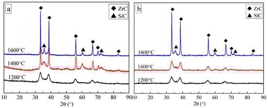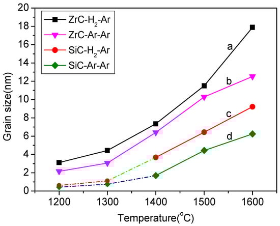 Compared the results shown in Figure 3a,b, it is concluded that the diffraction peaks of crystalline SiC formed by the Ar–Ar process at 1200 °C are close to those appeared by the H2–Ar process. With the temperature up to 1400 °C or 1600 °C, the diffraction peak shapes of crystalline ZrC formed via the H2–Ar process become sharper than those formed via the Ar–Ar process. It is also very clear that the crystallinity of SiC formed via the H2–Ar process is better than that via Ar–Ar process when the heat treatment is up to 1600 °C. That is, the introduction of H2 atmosphere below 1000 °C has effect on the growth of ZrC and SiC grain sizes at 1600 °C, which is got to know via the following analysis.