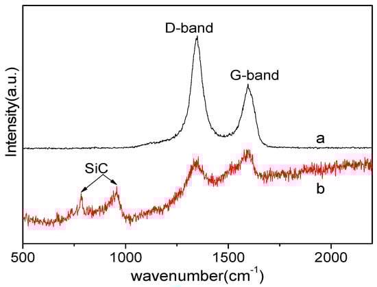 Raman spectra of the SiC–ZrC fibers obtained at 1600 °C via the Ar–Ar process (a) and the H2–Ar process (b).
