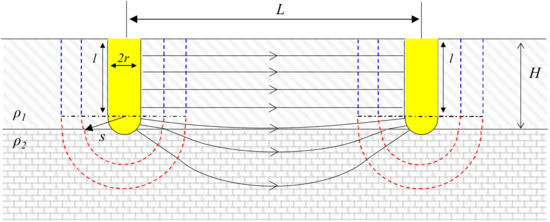 Theoretical electrical resistance for two spherical-tipped cylindrical electrodes was formulated in a previous study [12]. In Figure 1, the same electrical resistivity of each layer (ρ1 = ρ2) indicates homogeneous medium. The equipotential surface area of a cylindrical electrode with half spherical end, whose radius is r and penetration depth is l, can be represented in terms of the shortest distance between the electrode center line and an arbitrary point s. As such, the equipotential surface area of one cylindrical electrode is given as