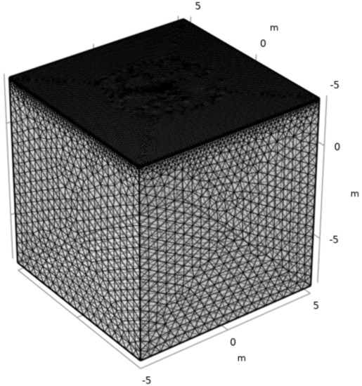 Finite element analysis using COMSOL Multiphysics was conducted to validate the derived equations. The AC/DC module solves partial differential equations (Laplace’s equation) and represents the electrical density distribution among electrodes. As shown in Figure 4, tetrahedral meshes are constructed using the inherent mesh generation function in the numerical simulation tool wherein the finer mesh is generated near two electrodes. The model geometry corresponds to a 10-m cube. The side and bottom boundary were modeled with an insulation layer. The electrode is located 4 m away from size boundary and, thus, the boundary effect becomes negligible. A 1−A electric current was applied to one electrode and the electrical resistance between the two electrodes was obtained using the potential difference divided by the applied electric current. Forty-eight cases were simulated to see the smooth trend line compared to theoretical equation which varies with the distance between the two electrodes (L), the penetration depth (l), the radius (r), the thickness of the upper layer (H), and the electrical resistivity ratio (k). All cases are listed in Table 1.