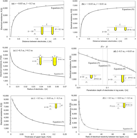 - The derived equations for the electrical resistance between two spherical-tipped cylindrical electrodes with different penetration depths can be represented as a combination of the inherent electrical resistivity of two layers (ρ1 and ρ2), the thickness of the upper layer (H), and the electrode geometries (i.e., the radius (r) and penetration depth (l)) and the distance (L) between them.