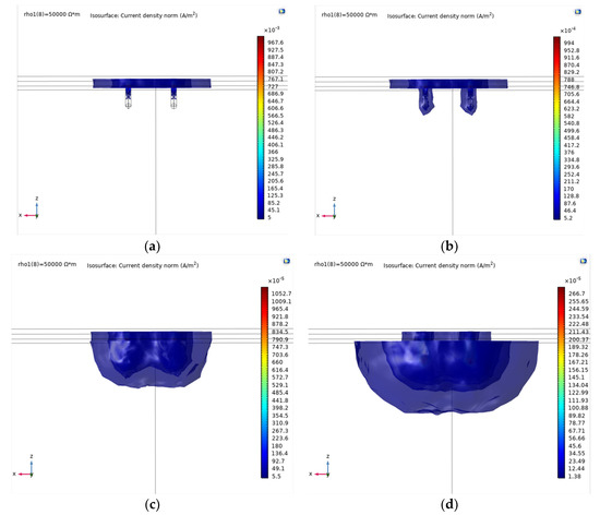 Electrical current density in different electrical mismatch ratio: (a) k = 100; (b) k = 10; (c) k = 1; (d) k = 0.1. The electrode geometries are radius r = 0.03 m, penetration depth l = 0.3 m, and distance L = 0.5 m. The layer formations are thickness of upper layer H = 0.1 m and the bottom layer’s electrical resistivity ρ2 = 5000 Ω∙m.