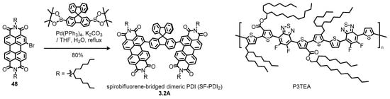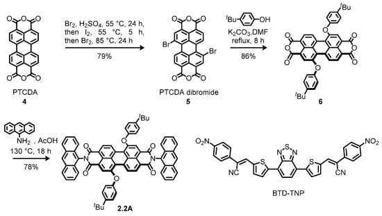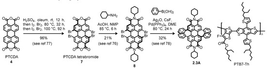 - Welsh, T.A.; Laventure, A.; Welch, G.C. Direct (Hetero)Arylation for the Synthesis of Molecular Materials: Coupling Thieno[3,4-c]pyrrole-4,6-dione with Perylene Diimide to Yield Novel Non-Fullerene Acceptors for Organic Solar Cells. Molecules 2018, 23, 931. [Google Scholar] [CrossRef] [PubMed]