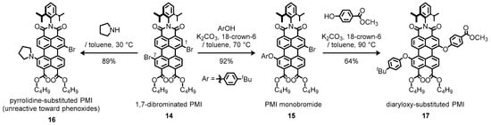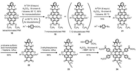 - Pagoaga, B.; Giraudet, L.; Hoffmann, N. Synthesis and Characterisation of 1,7-Di- and Inherently Chiral 1,12-Di- and 1,6,7,12-Tetraarylperylenetetracarbox-3,4:9,10-diimides. Eur. J. Org. Chem. 2014, 5178–5195. [Google Scholar] [CrossRef]