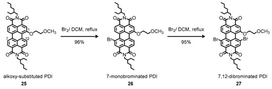 - Takahashi, M.; Asaba, K.; Lua, T.T.; Inuzuka, T.; Uemura, N.; Sakamoto, M.; Sengoku, T.; Yoda, H. Controllable Monobromination of Perylene Ring System: Synthesis of Bay-Functionalized Perylene Dyes. J. Org. Chem. 2018, 83, 624–631. [Google Scholar] [CrossRef]