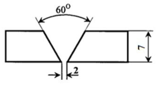 For the experimental welding, we cut several 150 × 250 mm sheets from 7 mm thick J55 microalloyed steel, whose edges were then prepared according to Figure 1.