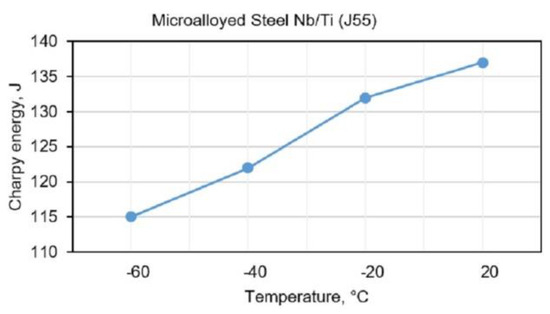 Impact toughness of BM Nb/Ti (J55) at different temperatures.