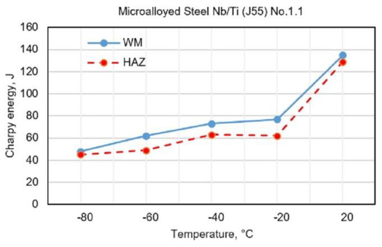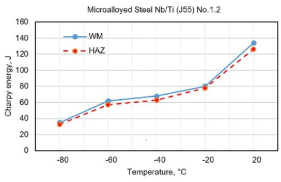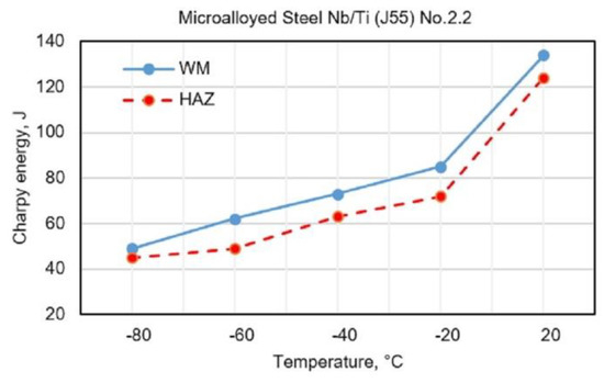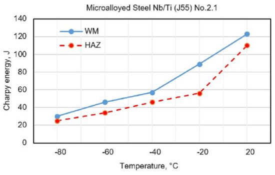 The diagrams (Figure 5 and Figure 6) show the changes in toughness depending on the test temperature of WM and HAZ of J55 BMl when using flux-cored electrodes with the following designations: No.2.1 (0.68% Mn + 1.868% Ni + 0.241% Mo) and No.2.2 (0.89% Mn + 3.245% Ni + 0.307% Mo). Figure 5 and Figure 6 show a small increase in the toughness of HAZ and WM due to the increased content of Ni and Mn in WM.