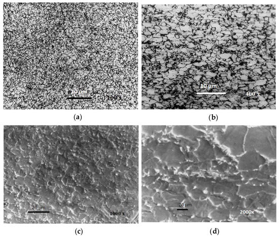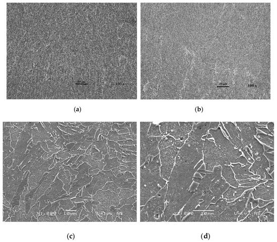 Figure 9 shows the microstructure of J55 microalloyed steel, which was analyzed under the optical microscopy (OM) (a,b) and the SEM (c,d) microscope.