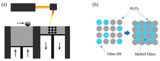 Mechanism of density improvement of glass/Al2O3 composite: (a) 3D printing powder bed fusion (PBF) process; and (b) schematic of glass frit/Al2O3 composite.