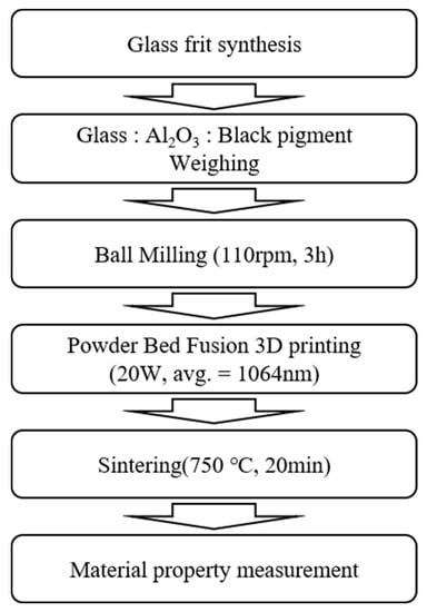 Meanwhile, ceramic materials are widely used in the construction, automotive, aerospace, electronics, biomedical, and chemical industries because of their excellent chemical resistance and hardness [,,]. However, as ceramics have high melting points, it is difficult to manufacture complex structures using molds []. On the other hand, glass-ceramic materials exhibit high chemical stability, high transmittance, excellent hardness, and a relatively low melting temperature (<1400 °C); thus, they can be used to fabricate complex-shaped products by using molds and injecting glass. However, the need for complex molds increases the manufacturing costs, thereby resulting in process limitations. Moreover, as glass ceramics are brittle and easily prone to breaking, their use is restricted to products requiring high toughness. Therefore, researchers are looking to harness 3D printing technologies to fabricate complex shapes [,,,].