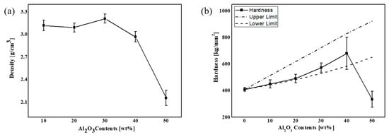 Figure 8 shows the plots of the density and hardness of the various samples as functions of the Al2O3 content. From Figure 8a, we note that with an increase in the Al2O3 content and a decrease in the glass content, the molten glass does sufficiently envelop the Al2O3 particles, thereby leading to a density decrease. Here, we note that the densities of the glass, Al2O3, and black pigment were 3.20 g/cm3, 3.95 g/cm3, and 5.6 g/cm3, respectively, and the theoretical density of the composite was obtained in proportion to the lever rule. The calculated theoretical and experimental densities are listed in Table 2. We note that the overall density remains high at ~95.3% of the theoretical density of 3.42 g/cm3 for the Al2O3 range of 10% to 30%, and the density significantly reduces when the Al2O3 content increases to 40%; this result corresponds to the SEM images in Figure 7. Therefore, the efficiency of 3D printing can be maximized by setting the Al2O3 content to 30%, which yields the highest density (95.3%). Meanwhile, from Figure 8b, we note that the hardness increases with increase in the Al2O3 content; the hardness increases from 452 HV for the Al2O3 content of 10% to 772 HV for the Al2O3 content of 40%, and subsequently it decreases to 337 HV for the Al2O3 content of 50%. This is because there is an insufficient amount of glass available to envelop the Al2O3 in the glass/Al2O3 composite as the Al2O3 content increases. The experimentally obtained results were closer to the estimated lower bound, which is thought to be related to insufficient densities of the experimental samples. The average hardness values for the composite with Al2O3 ranging from 10% to 40% were within the upper and lower bounds but the value for 50% was out of the estimated bound, which can be explained from the relatively low experimental density. Therefore, from Figure 7a,b and Figure 8, we can confirm that the Al2O3 content of 30% is the most suitable for 3D printing.