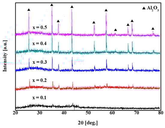 X-ray diffraction (XRD) results of [xglass/(1 − x)Al2O3)] composite samples for x = 0.1 − 0.5 Al2O3.