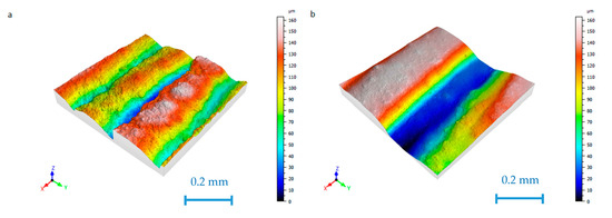 Figure 2a, corresponding to sample 5, shows parallel crests which are consistent with the edges of the different printing layers, with round peaks and sharper valleys. In contrast, in Figure 2b, corresponding to sample 10, higher crests with wider and deeper valleys are observed, although the Sa value is only slightly higher than for sample 5.