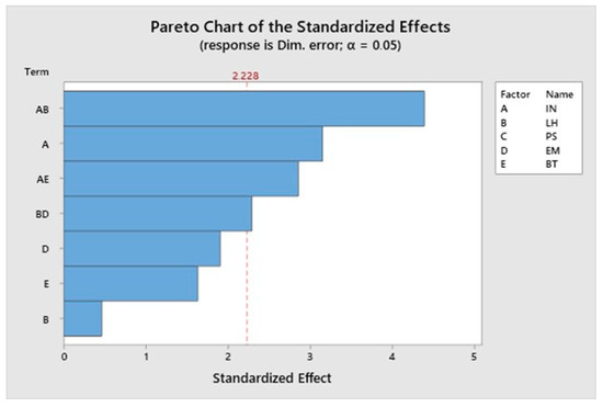 A full linear model was obtained with adjusted R2 value of 91.90%. In order to simplify it, a reduced linear model was sought for average dimensional error, which is presented in Equation (2), with an adjusted R2 value of 69.71%.