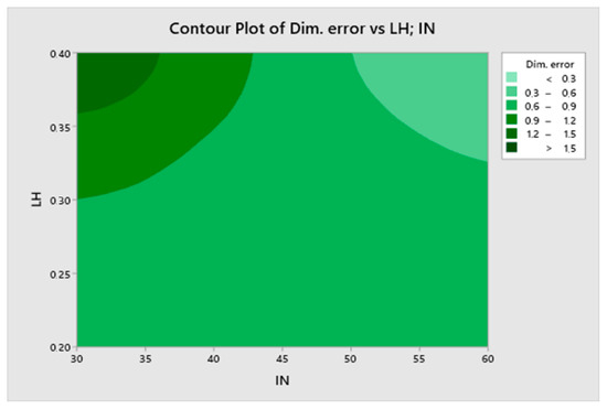The most significant effect on the dimensional error is the interaction between infill and layer height, followed by infill and then by the interaction between infill and temperature. Printing speed is not a significant factor for the dimensional error. Figure 4 corresponds to a contour plot of the dimensional error vs. infill and layer height.