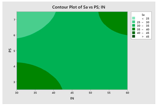 The most significant term is the interaction between infill and printing speed, followed by the interaction between layer height and temperature. The extrusion multiplier has no significant effect on roughness. Figure 6 depicts a contour plot of Sa vs. infill and printing speed, whose interaction is the most significant term of the model.