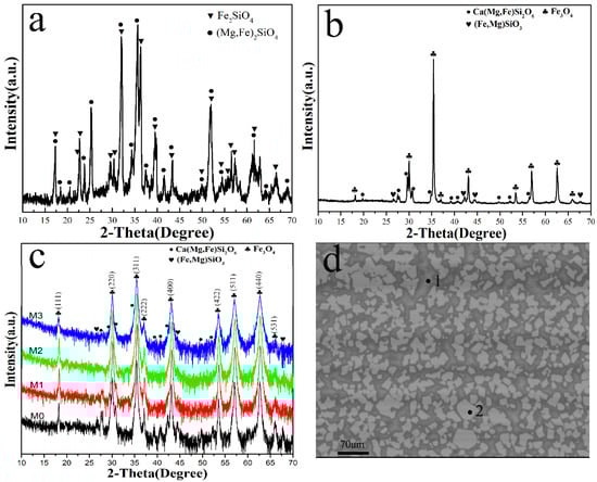 The backscattering electron image of the oxidized nickel slag (shown in Figure 1d) demonstrates that the main phases in areas marked with 1 and 2 are assigned to silicate and magnetite, respectively, according to data analysis in Table 3. Mg and Si content in point 2 were 3.1 and 0 wt%; implying that Mg incorporates into magnetite lattice during high-temperature treatment. This seems reasonable since the ionic radius of Fe2+ approaches that of Mg2+.