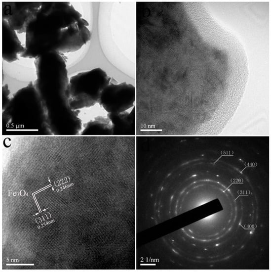 The particle size of the M0 sample is in the range of 20–60 μm (see Figure 3 and Figure 4). It can be seen that most of these particles exhibit irregular shapes and the ball milling effectively reduces particle size. Even though ball milling is beneficial in improving some properties, overextended milling has an alternative effect, for example, particles milled for 12 h start to agglomerate (see Figure 3d) owing to the increase in particle surface energy. Particle size distribution with different ball milling times indicates that the ball milling method can effectively tailor particle size and improve its distribution, as shown in Figure 4. TEM images of sample M3 show that particles possess irregular shapes and slight agglomeration, in the size range of 0.1–1 μm, as shown in Figure 5a. Besides, there is an amorphous layer on the surface of magnetite particles, as shown in Figure 5b, which could be a result of excessive ball milling. HR-TEM results demonstrate the lattice fringes to be 0.246 and 0.254 nm apart, which correspond to the (222) and (311) planes of magnetite, respectively (see Figure 5c). SAED data shows the diffraction rings assigned to the (220), (311), (400), (511), and (440) planes of magnetite (see Figure 5d), which agrees well with the XRD results: