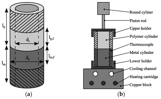 The specimens were manufactured using a heat conduction hot-pressing process. Figure 1b illustrates the hot-pressing tool. Beforehand, metal and polymer components were ultrasonically cleaned in ethanol. During the hot pressing process, an isobaric pressure (0.2 MPa) was applied to the specimen interface. The copper block was heated until the polymer in the interface melted and then air-cooled until the interface temperature reached 373 K. Finally, the pressure was removed and the specimen was taken. The resulting joining time was approximately 10 min per specimen. After the joining process, the specimens were reworked by turning to ensure equal measurements as well as enough centricity for testing. A detailed description of the manufacturing process can be found in a preceding study of Saborowski et al. [19].