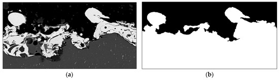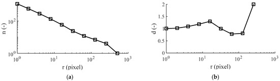 The term fractal refers to the work of Mandelbrot [21]. Fractal geometry permits non-integer dimensions that describe the complexity of natural objects such as rough surfaces. In this context, Figure 2 illustrates how the interface line is deduced from cross-sectional images and how the fractal dimension approach is applied to it. The cross-sectional image (2048 by 1536 pixels) is recorded with a LEO1455VP scanning electron microscope (Carl Zeiss Microscopy GmbH, Jena, Germany). The image is further processed and binarized with GIMP 2 image manipulation software. Thereby, embedding resin and metal surface are separated from each other by the fuzzy select function that allows area selection based on color similarity. Afterwards, a MATLAB® algorithm is used for the identification of the interface line. The identified line is transferred and centered to a white, quadratic image, whereby the side length in pixels equals a power of 2 (e.g., 2048 pixels). Finally, the box-counting algorithm is applied. Thereby, the image is divided in squares of size r. For each ri, a certain number of squares ni, containing at least one black pixel, exists. Beginning from the smallest possible box size of rmin = 1 pixel, the box size is increased stepwise by a power of 2 until the maximum box size rmax, covering the complete image, is reached. Plotting n(r) in a logarithmic scale results in Figure 3a. The average negative slope of this curve equals the fractal dimension of the interface line. The slope between individual box sizes d shown in Figure 3b is calculated by Equation (3). The fractal dimension of the interface line D is calculated according to Equation (4).