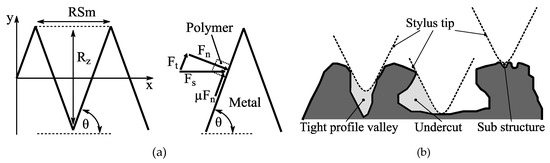 Tactile surface roughness measurements enable quick and inexpensive characterization of structured surfaces. In this context, a preceding study by Saborowski et al. [10] presented considerable accordance between surface roughness slope tanθ and the achieved interlaminar strength for various surface pretreatments in EN AW-6082/PA 6 PMH. Figure 6a illustrates a simplified model of the roughness profile deduced from the work of Chen et al. [15]. Thereby, ideally wedge-shaped profile elements as well as a friction coefficient µ between polymer and metal are assumed. The slope angle θ represents the relation between distance RSm and height Rz of the roughness features. In this simplified model, tanθ is related to the interlaminar strength in two ways. Firstly, a higher structure density is indicated as more profile elements are arranged within a given distance. Secondly, when a shear force Fs (e.g., induced by shear load or polymer shrinkage) is applied to the joint, the resulting normal force Fn = Fs sinθ and the tangential force Ft = Fs cosθ. An increase in θ leads to an increase in Fn. Thus, the maximum friction force µFn, hindering the polymer from slipping, is increased. Ft, which forces the polymer to slip, is decreased.