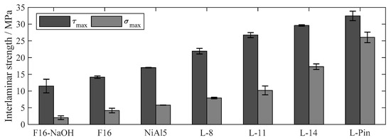Table 2 summarizes the test results as well as surface characteristics for all investigated surface pretreatments (SD denotes the standard deviation). Figure 7 shows the corresponding scanning electron microscopy (SE) images as well as cross-sectional back scattering detector (BSD) images. The corundum blasted surface (F16) has the highest Rz of all investigated surface structures, but second lowest D, tanθ, and interlaminar strength values. The surface provides several sharp-edged roughness features, but a low number of undercuts. Additional etching (F16-NaOH) leads to the formation of fine dents measuring 5–30 µm in diameter on the coarse blasted structures. However, sharp edges as well as undercuts partially dissolve. As a result, Rz, tanθ, D, and interlaminar strength are slightly lower, even though a higher blasting pressure was used. The thermally sprayed surface (NiAl5) provides higher tanθ, D, as well as interlaminar strength than the corundum blasted surfaces. Atomization of spraying particles leads to a broad variety of structure sizes, reaching from <1 µm up to around 100 µm. Thereby, conglomeration of spraying particles leads to the formation of undercuts. The deterministic laser structuring processes (L-8, L-11, L-14) lead to pin-like structural elements of 7–10 µm in diameter, whereby a thickening of the pins with the increasing number of scans is observed. The average maximum structure height increases from 27 µm (8 scans) to 53 µm (14 scans). In accordance with the selected pulse and line distance of 13 µm, the distance between the pins is equal for all variations. As a result, D increases as expected with the number of scans. The stochastic pin surface structure (L-Pin) is characterized by steep, conical shaped profile elements of 40–80 µm in height and approximately 18 µm in distance. In contrast to the deterministic structures, the profile elements are stochastically distributed. D and the interlaminar strength show the highest value of all investigated surface structures.