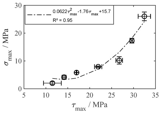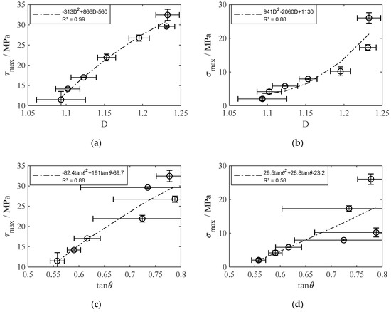As a nonlinear increase of τmax and σmax is expected with ascending D as well as tanθ, a second degree polynomial regression was carried out to determine strength prediction functions from the experimental data. Figure 9 shows the individual strength prediction functions for each surface parameter and load case. τmax (D) shows particularly high accordance (R2 = 0.99), whereas σmax (D) shows lower, but still acceptable accordance (R2 = 0.88). It is noteworthy that an improvement in surface structure affects the tensile strength much stronger than the shear strength. This is also confirmed from the tensile strength/shear strength ratio σmax (τmax) shown in Figure 10, where a slight increase in τmax is connected to a strong increase in σmax. Taking into account the high accordance (R2 = 0.95), tensile strength prediction from shear strength and vice versa is also reasonable.