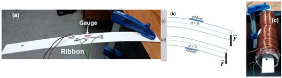 To characterize the magnetoelastic response of the sample, the evolution of Z under tensile and compressive stresses was performed. For this purpose, the magnetoelastic ribbon (5 cm in length) was fixed with an epoxy (Araldite, Ceys, Barcelona, Spain) on the surface of a flat plastic holder (0.2 cm thickness and 30 cm length) close to its middle point (see Figure 1a). One side of the plastic holder was fixed and the other hung up freely, in such a way that, when different loads were added to the free side, controlled mechanical stresses were applied to the sample. Due to the much larger thickness of the plastic support, the neutral axis of the system was placed along the longitudinal axis of the plastic holder (dashed line in Figure 1b) and, thus, the sign of the effective stresses applied to the ribbon was easily controlled. As Figure 1b shows, tensile stresses (σ > 0) were applied for a concave curvature and upward position of the ribbon, while compressive stresses (σ < 0) were produced for a convex curvature and downward position ((i) and (ii) in Figure 1b, respectively). The estimation of σ was performed through Hooke’s law, σ = Erεg, where Er = 100 GPa is the Young modulus of the ribbons and εg is the effective strain measured by a strain gauge (nominal resistance of 120 Ω and gauge factor 2.1) located close to the middle point of the ribbon (see Figure 1a).