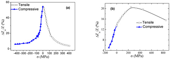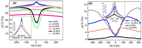 On the other hand, the sample P2 exhibits an opposite behavior (see Figure 4b), with the initial unstressed state characterized by a DP behavior. In this case, the application of tensile stresses (σ > 0) causes the displacement of the maximum of Z to higher H field values together with an increase in the maximum impedance variations, indicating a negative value of the magnetostriction constant (reinforcement of the transverse anisotropy field under σ > 0). An opposite effect is found for compressive stresses (σ < 0), namely, the displacement of the maximum toward lower H field values and a progressive decrease in the maximum impedance variations. Again, at H = 0, the results are consistent with Figure 3, where an increase in Z is produced with respect to the unstressed state when axial tensile stresses were applied (and vice versa, decrease in Z for σ < 0).