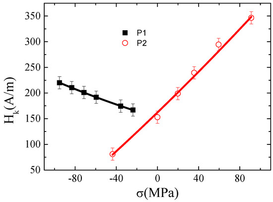 Values of λs0 = 1.4 × 10−7, k = 3.0 × 10−10 (MPa−1), and λs0 = −4.6 × 10−7, k = −2.6 × 10−10 (MPa−1) for P1 and P2, respectively, are obtained (where λs0 is the unstressed valued of the saturation magnetostriction and k is the measured slope of the linear dependence of λs with stress). Similar results were reported for nearly zero magnetostrictive amorphous alloys (λs0 ~ 10−7 and k ~ 10−10 (MPa−1)) employing the small angle magnetization rotation (SAMR) [27] technique and GSI effect [26].