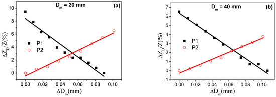 Relative variations of impedance, , as a function of the induced variations in probe diameter, ΔDm, for Dm (a) 20 mm and (b) 40 mm.
