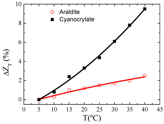 Furthermore, the mutual effect of temperature and fixing agent (epoxy or adhesive) in the transmission of mechanical stresses was checked. Therefore, two P1 ribbons with 5 cm length were fixed around the perimeter of a cylindrical probe of Dm = 20 mm employing two different fixing agents: epoxy adhesive (Araldite) and cyanoacrylate. Initially, the probe was introduced in a climate chamber (Binder KBF 115) to study, simultaneously, the evolution of the impedance with both adhesives when the temperature was changed from 5 to 40 °C. Finally, the transmission of mechanical stresses was examined. For that purpose, the same probe was subjected to standard mechanical tests at different temperatures, room temperature (RT = 20 °C) and T = 40, 50, and 60 °C. The evolution of the impedance of P1, , was simultaneously registered as a function of the probe diameter with both resins.