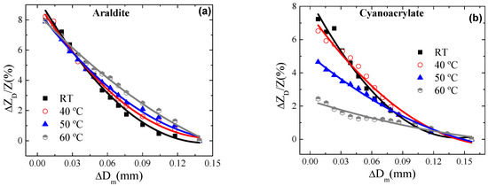 Relative variations of impedance, , as a function of the induced variations in probe diameter, ΔDm, when the sample was fixed with (a) Araldite and (b) cyanoacrylate. The temperatures were as follows: room temperature, 40 °C, 50 °C, and 60 °C.