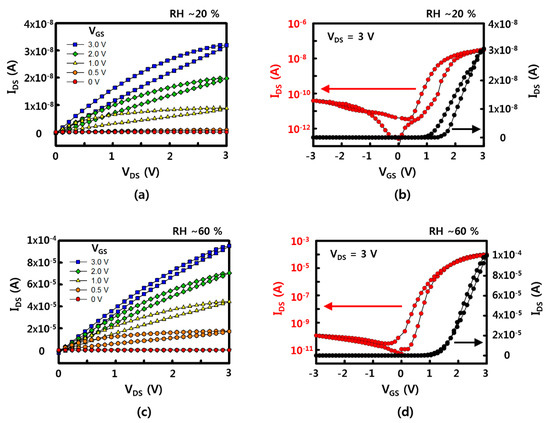 Electrical properties of a SnO2 NW FET device: (a,c) the drain-source current (IDS)–drain-source voltage (VDS) curve with variation of gate-source voltage (VGS) with a relative humidity (RH) of ~20% and ~60%, respectively; (b,d) the transfer curve of IDS-VGS at VDS = 3 V with a RH of ~20% and ~60%, respectively.