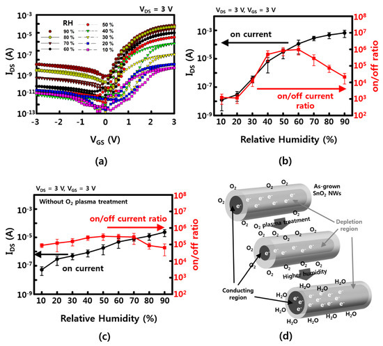 VGS–IDS characteristics are confirmed by increasing the RH to 10%, 20%, 40%, 50%, 60%, 70%, 80%, and 90% to compare the gate dependence effect. As shown in Figure 3a, the on current (at VGS = 3 V) which is 10−8 A at 10% RH, is almost exponentially increased up to ~10−4 A at 90% RH. However, the off current is increased as a function of RH, as well. The on/off current ratio has a maximum value of ~106 at 50% to 60% of RH. This can be explained by possible current leakages and/or less gate-effective depletion due to excessive water molecules that are absorbed on the NW surface. This leakage can be estimated with higher current values (IDS ~ 10−9 A at VGS = 0 V, VDS = 3 V) at a RH of 90%. The values of the on current and the on/off ratio of SnO2 NW FETs, which vary with humidity, are presented in Figure 3b,c. In the case of SnO2 NWs, an n-type semiconductor has electrons as major carriers, and a 1D nanostructure has a large surface/volume ratio, which is affected by the adsorption–desorption of various gas molecules, including water molecules near the surface. When the O2 plasma is treated, the depletion region of the NW surface is increased by the physical collision of energetic oxygen atom/molecules on the surface and the O2 molecules adsorbed on the surface. Figure 3c shows the on current and the on/off ratio of O2 plasma-untreated NW FETs. The on current of untreated devices at a low RH between 10% and 20% is higher than that of O2 plasma-treated devices because the surface did not affect by collision of energetic O2 molecules yet. Although the on current was increased as a function of RH, the sensitivity (<102) of untreated devices, which is varies with an RH of between 20% and 60%, showed to be much lower than that of O2 plasma-treated devices (~104). Furthermore, the channel region, which is a passage through which the major carrier electron can pass, is reduced (see Figure 3d). At this time, the number of water molecules in the vicinity increases the probability that the water molecules are adsorbed on the surface of the NWs in place of the O2 molecules adsorbed on the surface of the NWs as the humidity increases, thereby reducing the depletion region enlarged by the O2 molecules. In addition, the channel is made large by the positive voltage (gate field), so that the electron can pass more quickly than the case without gate voltage [20,21]. Similarly, SnO2 NWs are known to be used as gas sensors that can detect a variety of gas molecules, including water molecules, such as carbon monoxide, carbon dioxide, ammonia, and nitrogen dioxide.