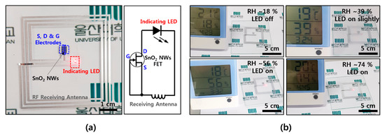 In order to utilize the wearable electronics as a humidity sensor, a wirelessly driven SnO2 humidity sensor was fabricated on a thin film of a flexible soft material. An antenna (width: 200 μm, spacing: 200 μm, overall size: 5 cm × 5 cm) that can receive an RF signal with a frequency of 13.56 MHz, which is the communication standard of NFC, was configured and connected to the source and gate electrodes of the FET device, in order to be operated wirelessly without a battery. When the RF signal is received with an antenna, the gate increases the conducting region and the current flows sufficiently to operate the LED indicator. Figure 4a shows the overall shape of the device and shows a circuit consisting of a receiving antenna, an FET device, and an LED indicator. A transmitting power of 4 W and a distance of 5 cm from the transmitting antenna are required for the 5 cm × 5 cm receiving antenna, while an antenna with a width of 200 μm, spacing of 200 μm with three turns, NW FET channel width of 600 μm, channel length of ~40 μm, and density of 1~2 NWs/μm is configured. As shown in Figure 4b, the LED, which is not driven at an RH of ~18%, is driven from a RH of ~39%, and shows higher light intensity at a RH of ~56% and ~74%. It is confirmed that the operation range can be controlled by properties of the transmitting/receiving antenna and the dimension of the FET channel. In the case of humidity, it is difficult to change environmental conditions quickly, and the reaction rate is also known to be slower here than in other gas molecules. However, it is expected to be used as a humidity alarm for providing a warning of high humidity in wearable electronics, based on the results of this study. It is also expected to be easily applied to commercial card readers or smartphones with NFC by utilizing existing NFC-based wireless communication without an additional battery on the device itself.