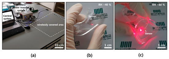 For the wearable applications, a soft and flexible form of electronics is needed, as well as a wireless capacity. Unlike a conventional electronic flatform, our skin or clothes have lower modulus, and there might be a modulus mismatch between the animal body (~kPa) and the silicon electronics (~GPa) [30,31]. Figure 5a shows a wireless power transfer system, control equipment, and a wirelessly covered area by transmitting antenna that is setup underneath. A commercial near field wireless power transfer system, Neurolux in here, offered diverse expandability on the design of transmitting antenna for applying it to all kinds of experimental apparatuses [31]. The sensor devices with a receiving antenna pattern could be easily operated by a simple single roof antenna underneath the desk without additional impedance matching circuit on the devices. Humidity sensor devices, which consist of soft and flexible elastomers (PDMS) and ultra-thin Al, were wirelessly operated on top of a transmitting antenna, even in bent (Figure 5b) and wrapped (Figure 5c) states.