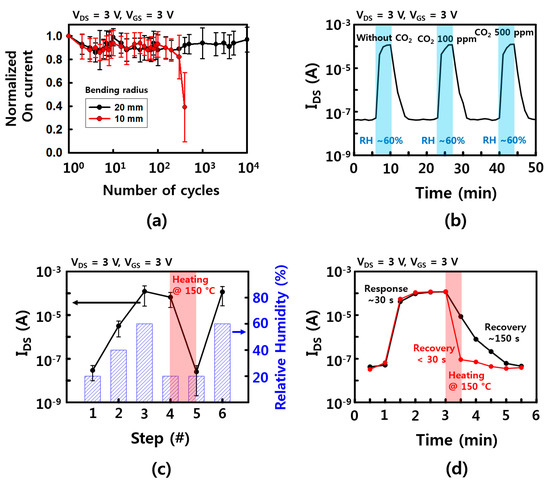 Device stability characteristics. (a) Mechanical stability of the sensor device. Normalized on current as a function of bending cycles with bending radius of 10, 20 mm; (b) Response and recovery time with/without CO2 gas (100 and 500 ppm); (c) the on current of the sensor devices depends on the condition of RH and the heating step for removal of water molecules; (d) response and recovery time with/without heating step. The error bars in (a,b) represent a 95% confidence interval.