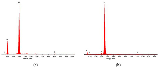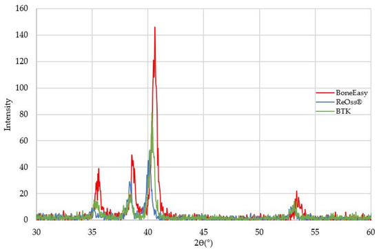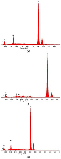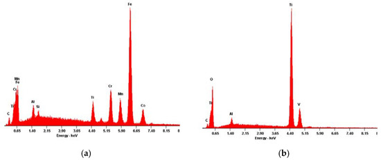 29]. In this way, the XRD identification of the β phase should allow the distinction between pure titanium and titanium alloy samples. However, since the Bragg reflections relative to the β phase were weaker than the α phase’s ones, they were easily overlapped [