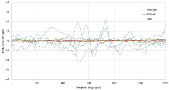 A simple plot evaluation corroborated with the already achieved inference that the different meshes presented considerably distinct topographies. In fact, while the BoneEasy’s mesh presented a very regular surface with minimal variation in the profile’s height, the surface of the Yxoss CBR® mesh from ReOss® displayed extremely profound profile variations, as substantially high and low peaks were registered. Considering the BTK 3D-MESH, it was possible to predicate that, even though the surface was not so uniform as the Mesh4U, it came closer to it than to the extremely irregular Yxoss CBR® mesh.