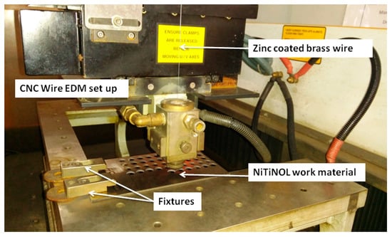 The machinability studies on medical grade NiTiNOL SMA were carried out using CNC WEDM (Model: Electronica Ecocut Elpuls,) at KLE Technological University, Hubballi, India. The received NiTiNOL alloy plate of 800 × 160 × 2 mm3 was initially cut into 100 × 160 × 2 mm3 plate to suit the mounting conditions in the WEDM work bed region. The experiments in WEDM were performed using zinc coated brass wire (ZnCBW) as an electrode material. The experimental set up of WEDM with NiTiNOL SMA and ZnCBW is shown in Figure 1.