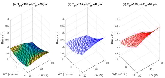 The proposed mathematical Equations (5)–(7) are used to visualize the performance characteristics of SR, MRR, and TWR, respectively. The effect of chosen process variables on proposed WEDM performance characteristics and related SEM/EDS analysis are depicted in Figure 2, Figure 3, Figure 4, Figure 5, Figure 6 and Figure 7. For analyzing all three output characteristics, the 3D response plots have been plotted as a function of SV with hold values for Ton, Toff at lower (Ton = 105 µs, Toff = 25 µs), middle (Ton = 115 µs, Toff = 40 µs), and higher values at (Ton = 125 µs, Toff = 40 µs), respectively, with three different levels of WF being 4, 6, and 8 m/min. From Figure 2, Figure 4 and Figure 6, it is clearly evident that there is a strong relation between the varying process parameters on the selected output responses.