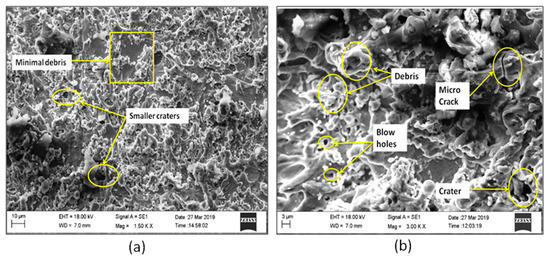 Surface morphology for higher and lower MRR: (a) SEM image for lower MRR and (b) SEM image for higher MRR.